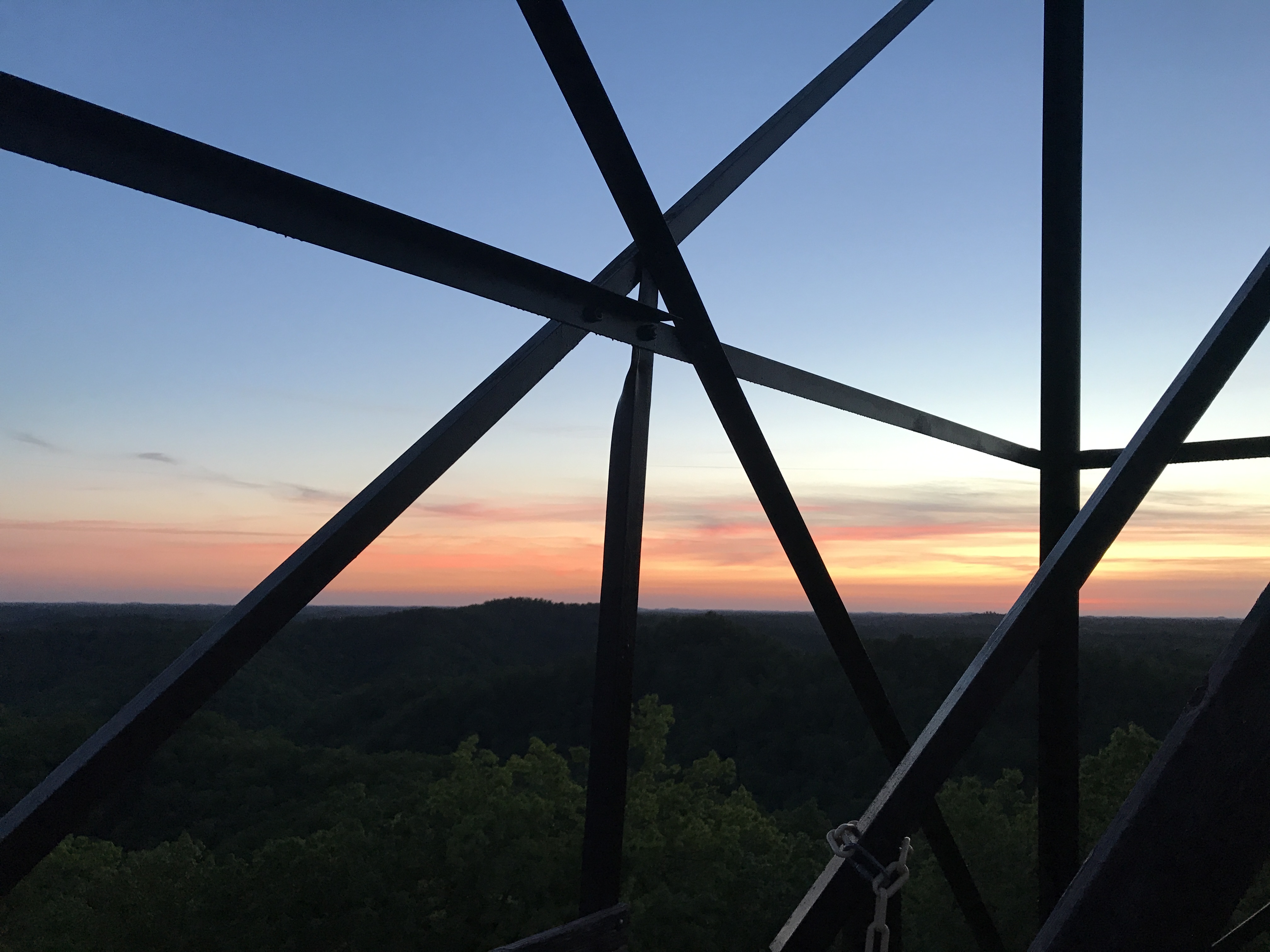 Shleby and I went to Robinson Forest. Those many holy mornings chasing the sunrise, the cold singing its hymns to me as I hiked by headlamplight past gleaming spiders’ eyes, past the sleeping copperheads, past the laurels adorning the trail. I raced to the fire tower to meet the suns eye just as it opened above the forest. Two weeks I wish I could live over again. Sitting amongst the ticks and tanagers and catchweed bedstraw, training my ears to discern the disparate songs of the birds of eastern kentucky–watching a spider leap across the broad leaf of a trillium.